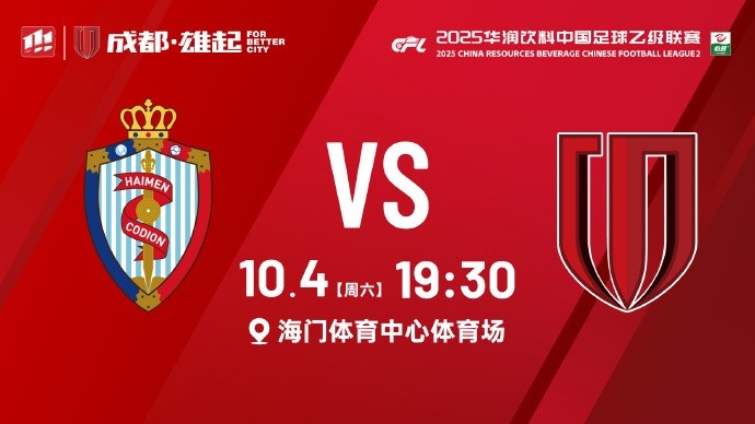 比赛日2025华润饮料中乙联赛 第28轮⚽ 海门珂缔缘 vs 成都蓉城B队📅 10月4日(周六)19:30🥅 海门体育中心体育...