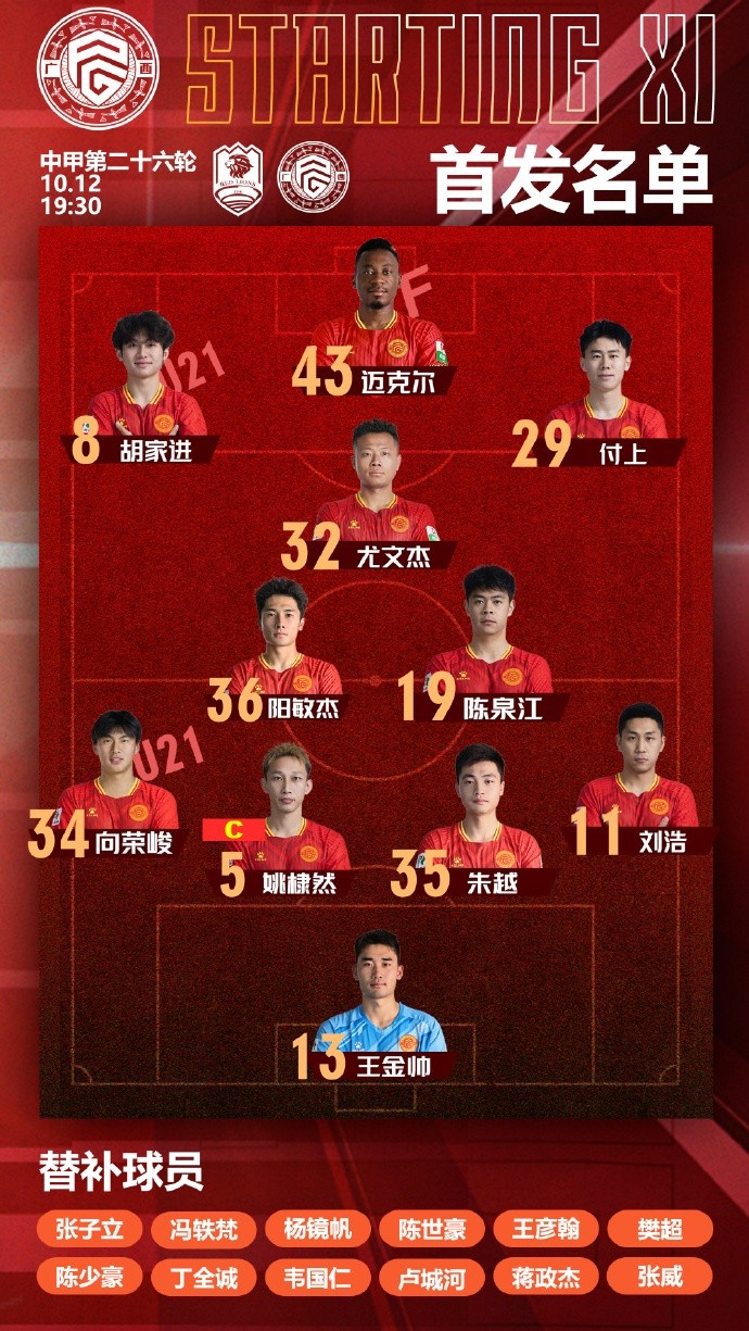2025华润饮料中甲联赛第26轮,广西平果国晶客战青岛红狮首发名单