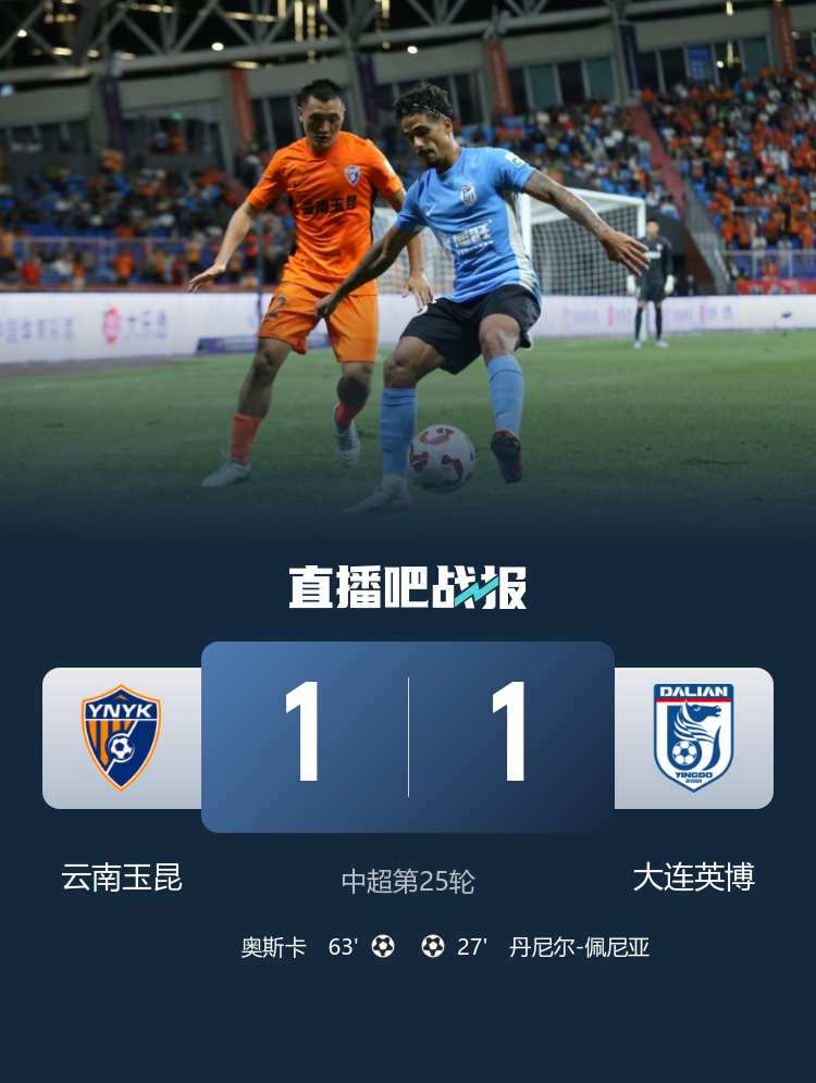 9月19日讯 北京时间9月19日晚上20:00,中超第25轮,云南玉昆坐镇玉溪高原体育运动中心体育场迎战大连英博。上半场,马镇失误送礼,佩尼亚笑纳。下半场,奥斯卡扳平,马镇扑单刀。全场比赛结束,云南玉昆1-1大连英博。本场过后,云南玉昆8胜7平10负积31分,排名中超积分榜第9;大连英博9胜6平9负积33分,排名中超积分榜第8。
