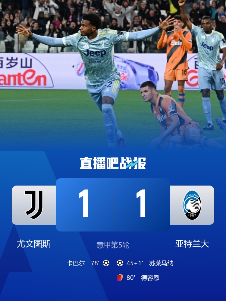 9月28日讯 北京时间9月28日凌晨0时整,2025-26赛季意甲第5轮在安联竞技场展开角逐,尤文图斯主场迎战亚特兰大。上半场卡卢卢中柱,阿季奇被断致丢球,下半场卡巴尔替补扳平,麦肯尼造红牌。最终尤文图斯主场1-1战平十人亚特兰大,尤文联赛开局5轮不败+两连平仍居第2,亚特兰大升至第3。