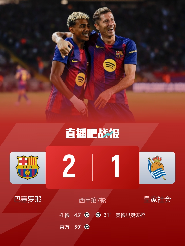 第59分钟,奥尔莫分球,替补登场的亚马尔右路突入禁区,随后传中球送到门前,莱万头球攻门击中立柱弹进网内,巴塞罗那2-1皇家社会。↓