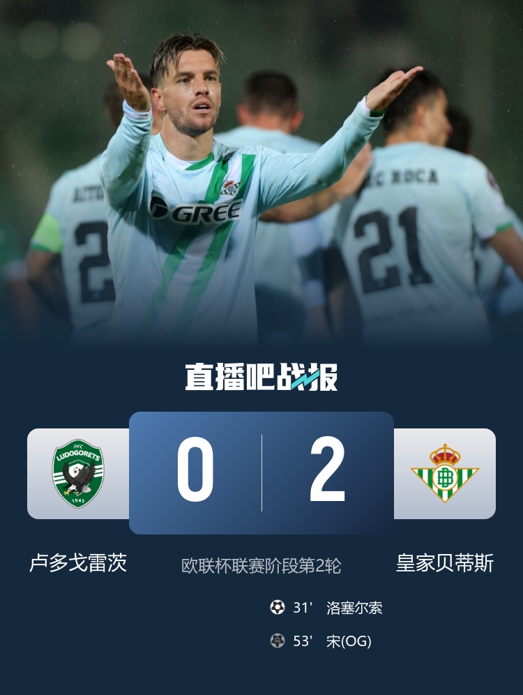 10月3日讯 北京时间0:45,欧联杯联赛阶段第2轮卢多戈雷茨vs皇家贝蒂斯。上半场,洛塞尔索远射帮助贝蒂斯取得领先!下半场,菲尔波造乌龙!最终,贝蒂斯2-0击败卢多戈雷茨,取得新赛季欧联首胜!