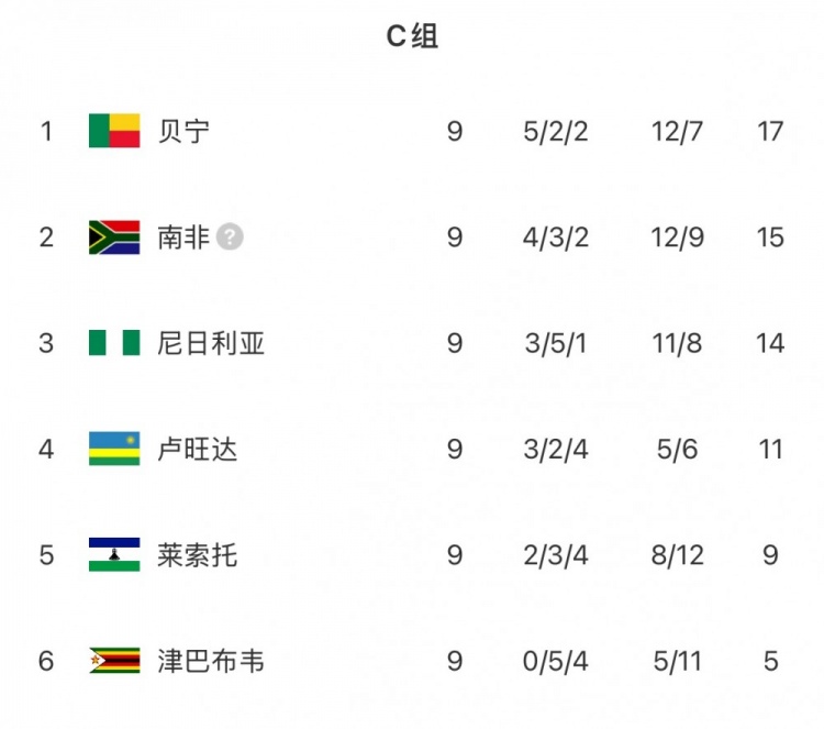 目前预选赛9轮战罢,尼日利亚3胜5平1负积14分,排在C组第三,距榜首贝宁有3分差距;莱索托9战2胜3平4负9分位列第五。