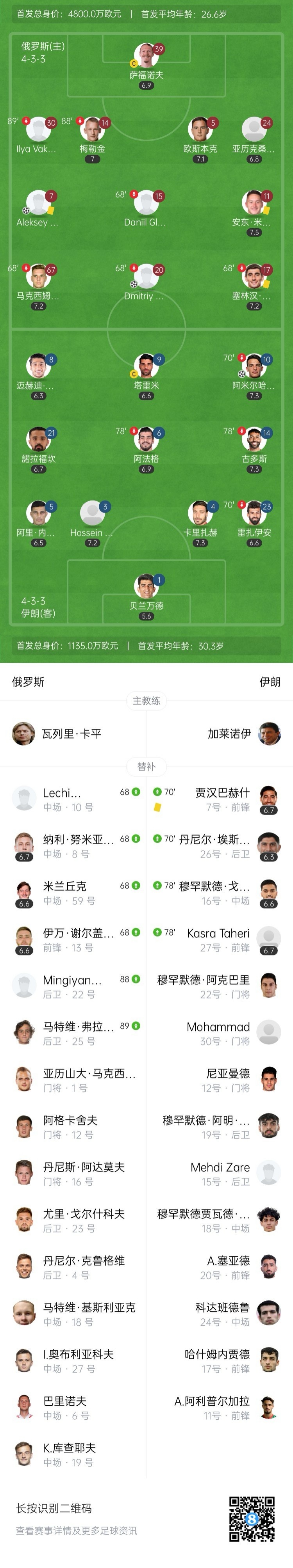 沃罗比约夫、巴特拉科夫为俄罗斯破门,伊朗队由胡赛恩扎德打进1球。